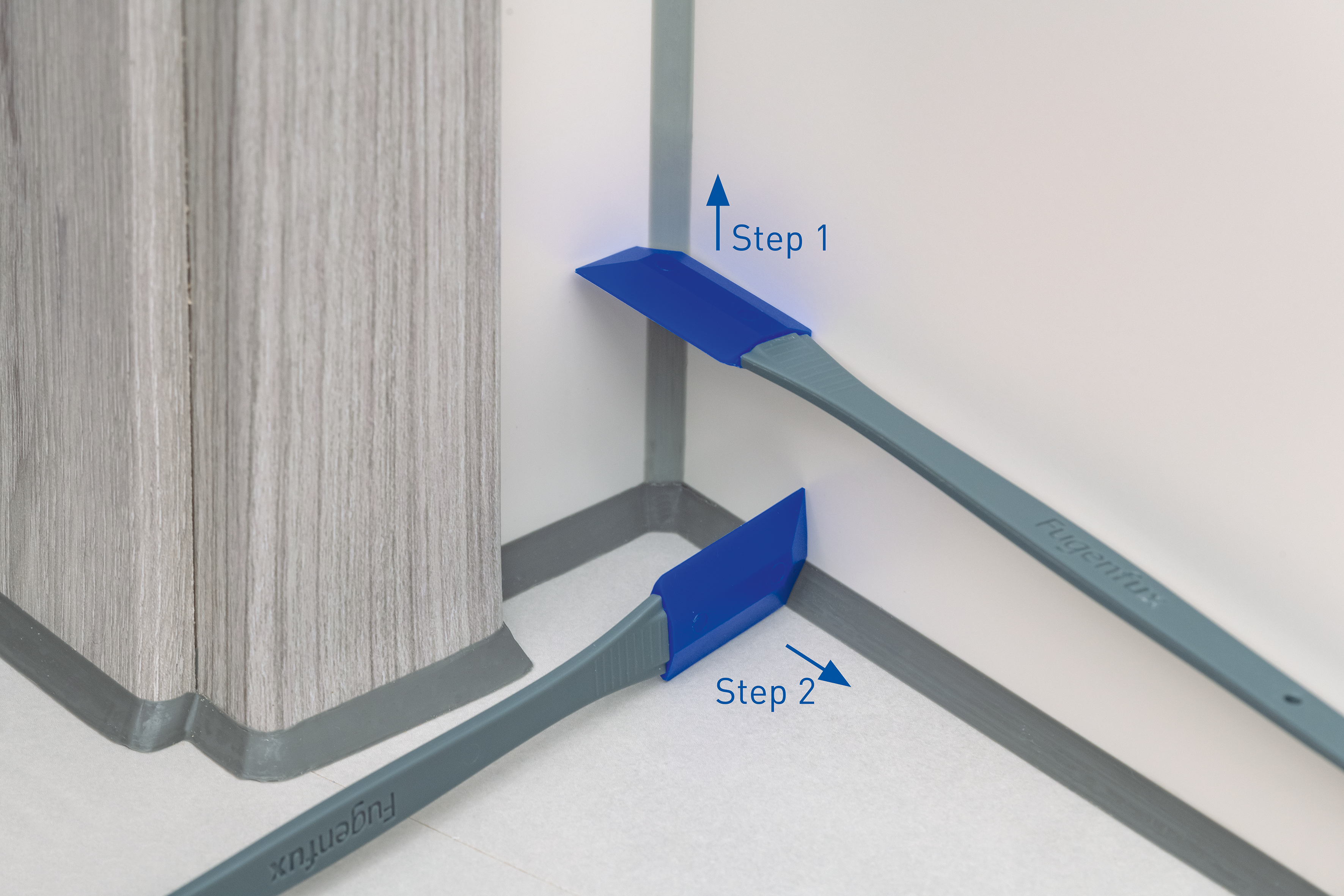 Van tevoren is het van belang om de Fugenfux 4'er set te bevochtigen in een schone bak. Hierna is het mogelijk om de FugenFux met gelijkmatige druk over de gevulde voeg te trekken. De overtollige afdichtkit kan in de afvalbak verwijdert worden.