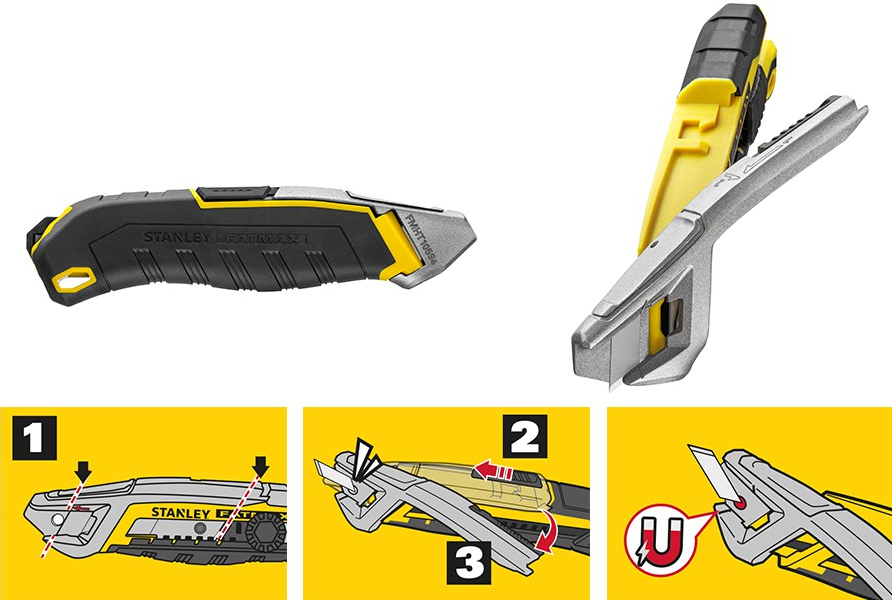 • Het STANLEY® FATMAX® 18mm Quick Snap afbreekmes heeft een uniek afbreekmechanisme waarmee het mes snel, eenvoudig en veilig kan worden afgebroken. U hoeft geen tweede gereedschap te gebruiken om het mes te breken en te verwijderen - u lijnt het mes gewoon uit, breekt het en snijdt verder met een nieuw scherp mes. Eens het mesje afgebroken is, wordt het vastgehouden door een geïntegreerde magneet, zodat u het veilig en gemakkelijk kunt weggooien.