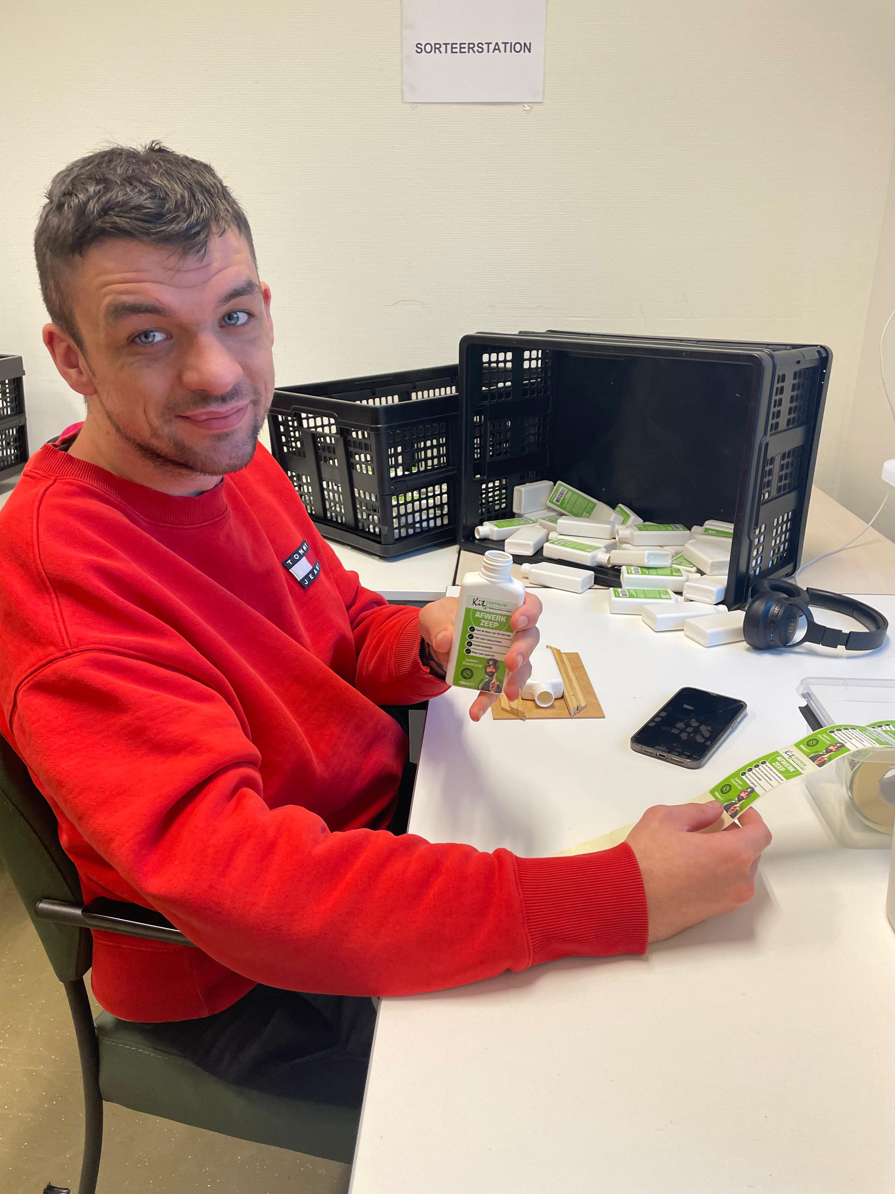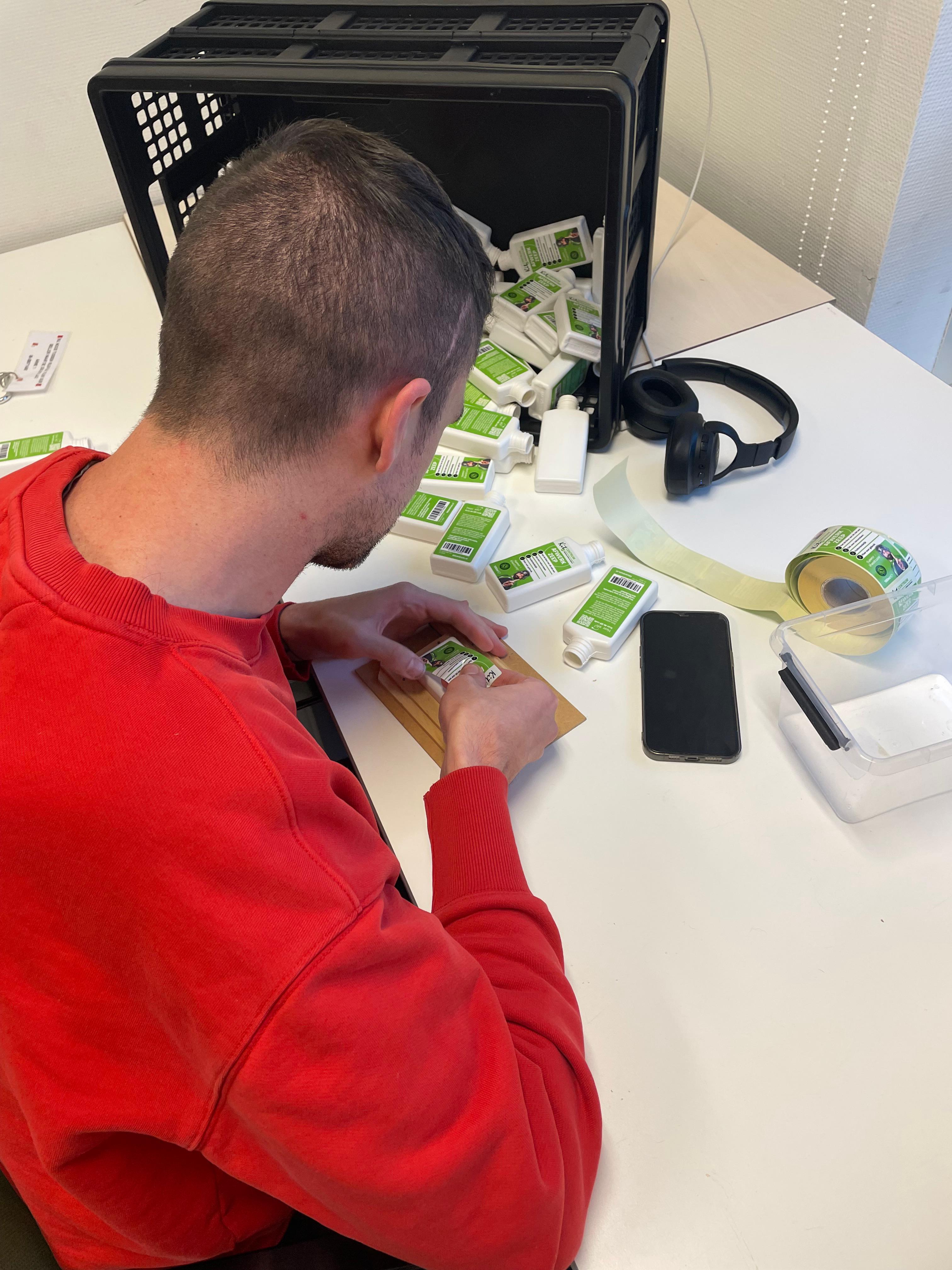Na het etiketteren gaan de flesjes door naar Ambelt, waar de leerlingen van het arbeidstrainingcentrum ze nauwkeurig afvullen. Met een slim bedacht afvulproces zorgen zij ervoor dat elke fles exact 100 ml afwerkzeep bevat.