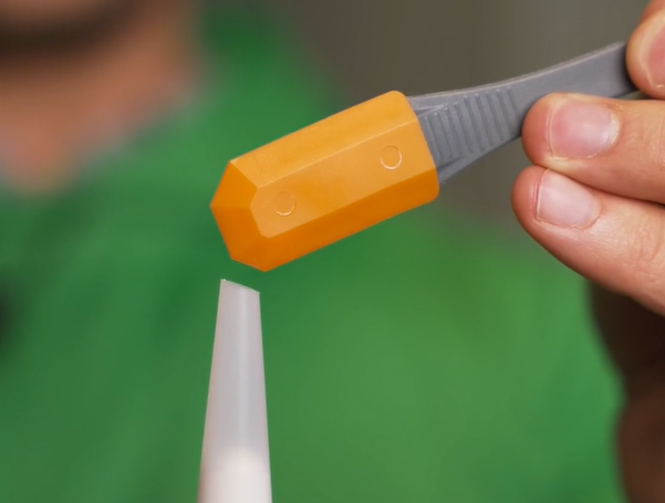 Voordat we echt gaan beginnen te kitten gaan we kijken naar de tuit. Deze moet namelijk de juiste breedte hebben. Snijd de tuit af op de breedte van de voeg. Hierdoor breng je in 1 keer de juiste hoeveelheid kit aan. Dit voorkomt verspillen en maakt het afwerken van de kit straks een stuk makkelijker. Je kan de tuit veilig afsnijden met behulp van een kokermes. Snijd de tuit niet te schuin af.