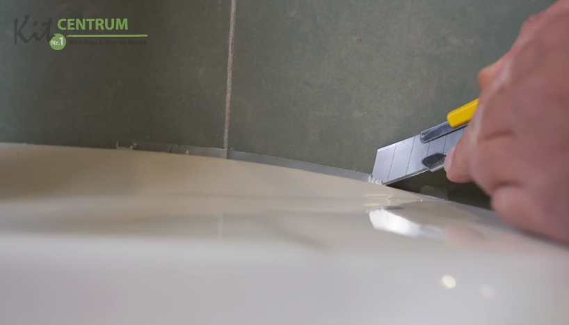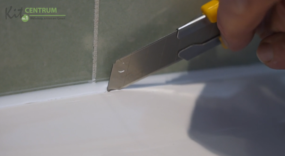 - Snijd de kit vervolgens ook aan de andere kant zo dicht mogelijk tegen de ondergrond aan weg.