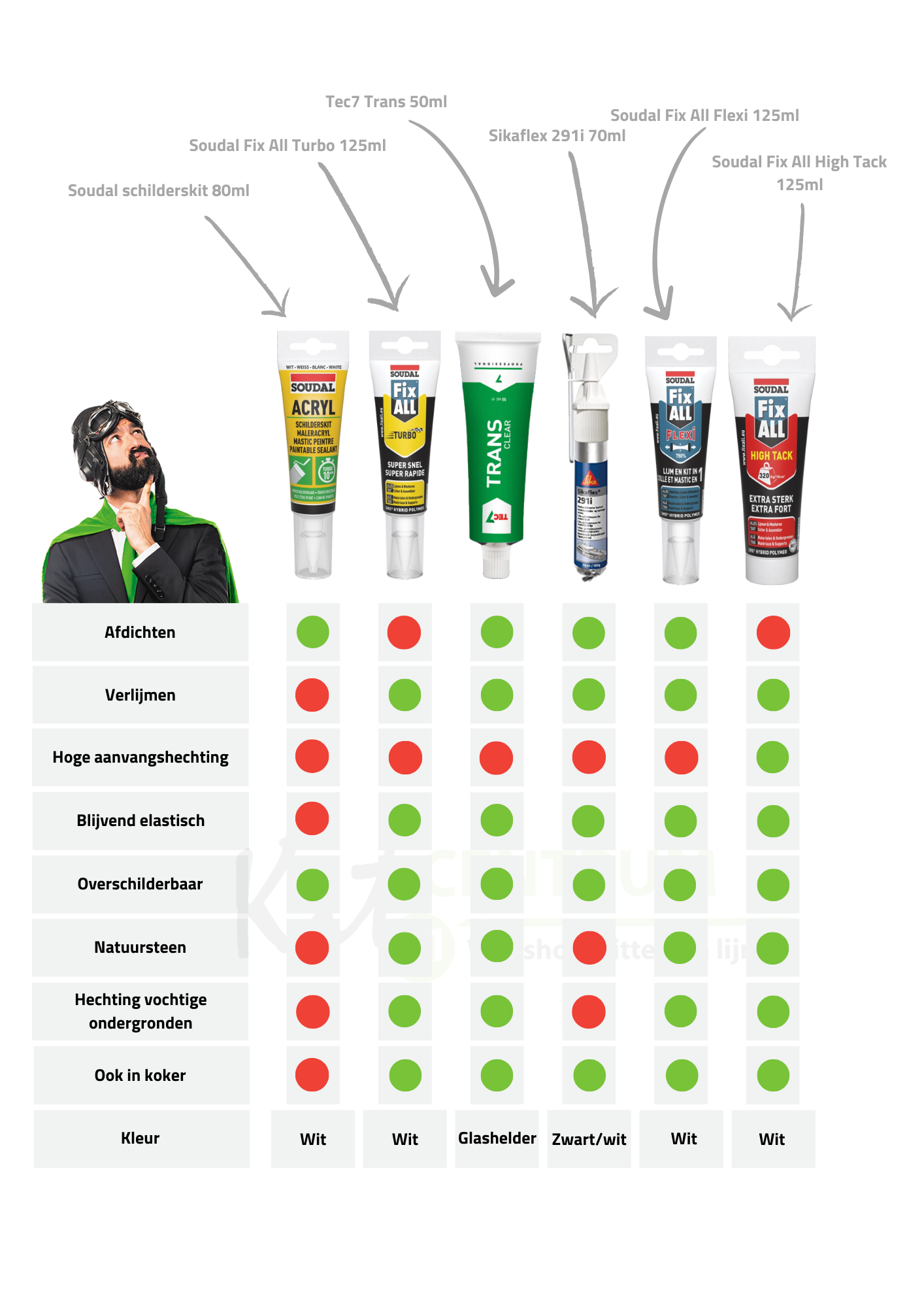 Oké, zes verschillende kitten en lijmen. Fijn, en nu? Nou nu gaan we de juiste kiezen! En een foto zegt meer dan duizend woorden. Daarom beginnen we met een overzicht van de kitten en de bijbehorende eigenschappen. Hier kan je al een keus maken. Nog wat meer informatie nodig? Onder de afbeelding gaan we verder en geven we per product gedetailleerdere informatie.