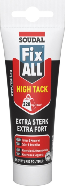 Yes! Er is ook een hightack die te verwerken is zonder kitpistool: de Soudal Fix All High Tack. Het belangrijkste kenmerk van een high tack is de hoge aanvangshechting. Dit betekent dat je verticaal materiaal kan verlijmen zonder ondersteuning. Nu dus ook in een makkelijke 125 ml verpakking. Perfect geschikt voor alle bouwmaterialen zoals hout, MDF, spaanplaat, panelen, etc. Het kan natuurlijk ook gebruikt worden voor schoolprojecten, kindersurprises en huis-tuin-en-keuken klusjes! Wat je ook plakt, ondersteunen is vrijwel nooit meer nodig.