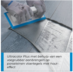 Gebruik het speciale MAPEI voegbord of rubberen wisser om de voegen met het Ultracolor Plus mengsel te vullen, zonder lege ruimtes of gaten achter te laten. Verwijder overtollig Ultracolor Plus van het oppervlak door met het voegbord of de rubberen wisser diagonaal over de voegen te gaan terwijl het mengsel nog vers is.