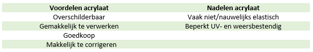 Een makkelijk te gebruiken kit. Een acrylaatkit wordt eigenlijk alleen binnen gebruikt, omdat het niet goed tegen water kan. Het is gemakkelijk aan te brengen, goed overschilderbaar en relatief goedkoop. Je hebt al een goede acrylaatkit voor ongeveer twee euro. Acrylaatkit is geschikt voor pleister, beton, kunststof en bijna alle houtsoorten. Ben je opzoek naar een goede acrylaatkit? Kies dan de Kitcentrum Anti-Crack Acrylaatkit.