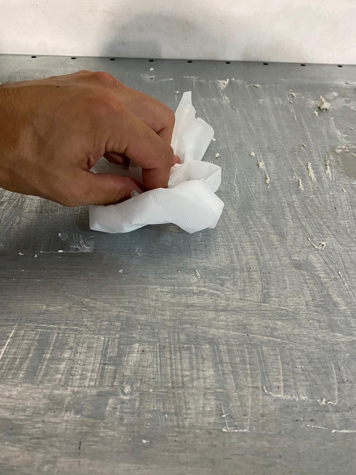 Het begint al ergens op te lijken! Het enige wat eigenlijk overblijft is de resten purschuim verwijderaar weghalen. Wij hebben gebruik gemaakt van vochtige doekjes. Deze reinigen namelijk erg goed en kan je weg gooien. Je kan vervolgens een droog doek gebruiken om de ondergrond droog te maken. Zo heb je niet al deze chemische producten in de wasmachine of aan schoonmaakdoekjes zitten waar je later het aanrecht mee wilt afnemen. Deze doekjes zijn bovendien ook erg handig om je gereedschap mee schoon te maken.