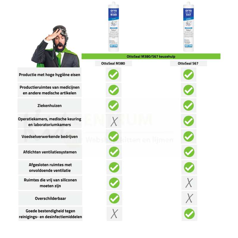 De meeste cleanroom kit heeft een basis van siliconen. Dat een cleanroom kit speciaal gecertificeerd is, betekent niet dat het alleen voor cleanrooms te gebruiken is. Het keurmerk of de geschiktheid is echt een extra toevoeging op de standaard eigenschappen. Hetzelfde geldt bijvoorbeeld voor brandwerende acrylaatkitten. Benieuwd naar de specifieke voordelen van een cleanroom polymeer of siliconen? Kijk hieronder naar het verschil tussen de Ottoseal M380 (polymeerkit) en de Ottoseal S67 (siliconenkit):