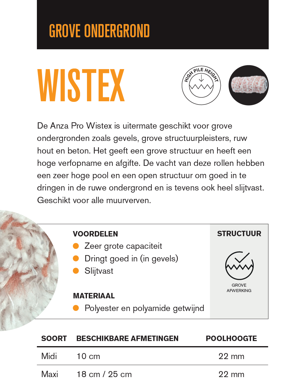 De ANZA verfroller Wistex is uitermate geschikt voor grove ondergronden zoals gevels, grove structuurpleisters, ruw hout en beton. Het geeft een grove structuur en heeft een hoge verfopname en afgifte. Deze vachtroller heeft een 22 mm pool hoogte met  een zeer hoge verfopname en is geschikt voor iedere muurverf. ANZA Roller Wistex | Verfrollers | Kitcentrum - Kitcentrum.nl